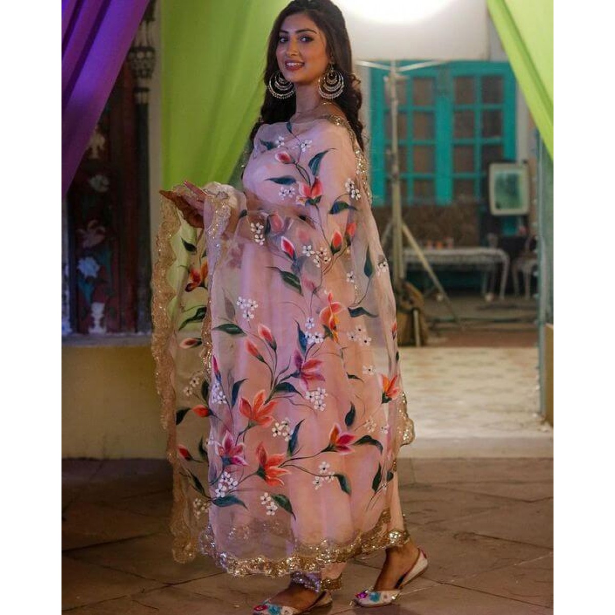 Peach color festival sharara suit with organza dupatta